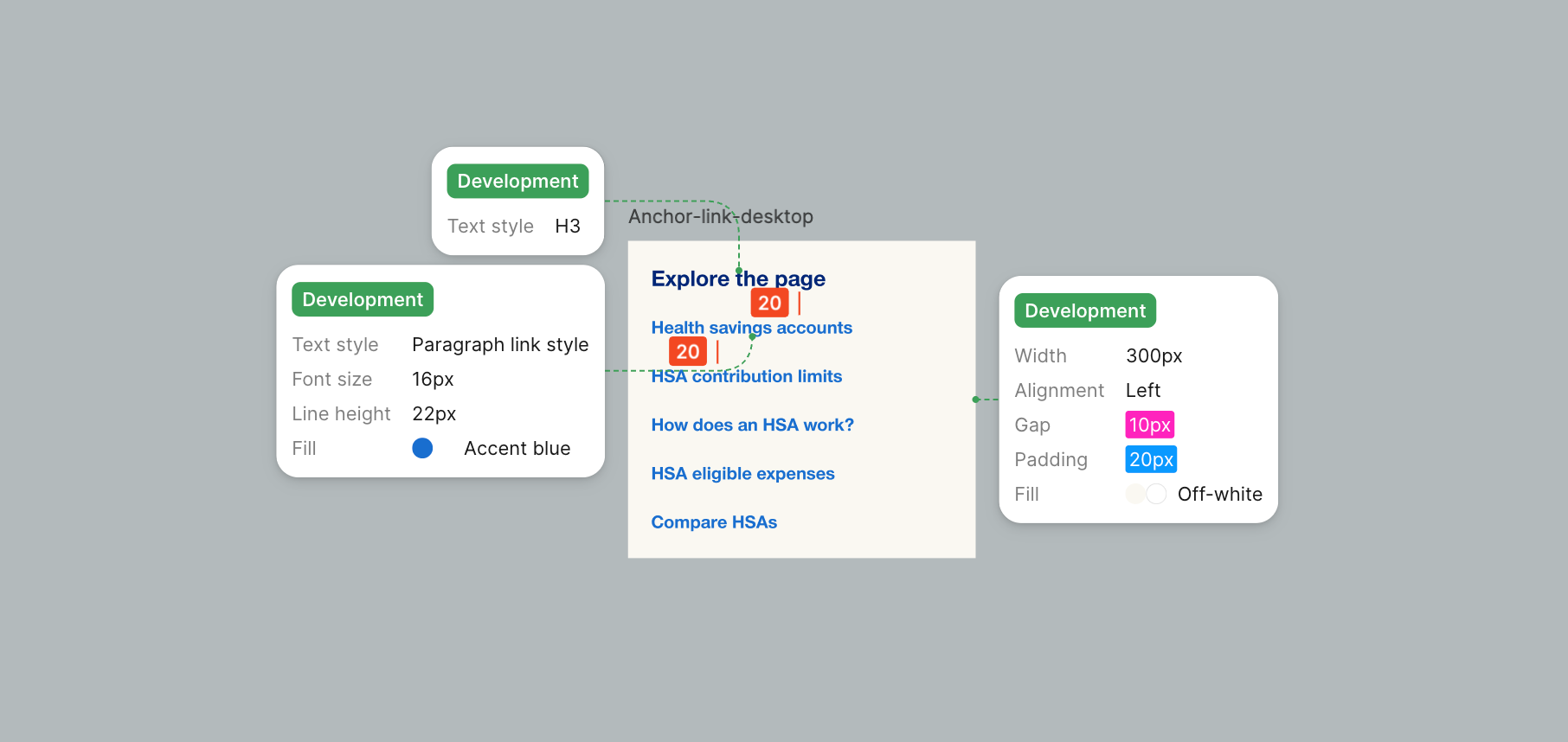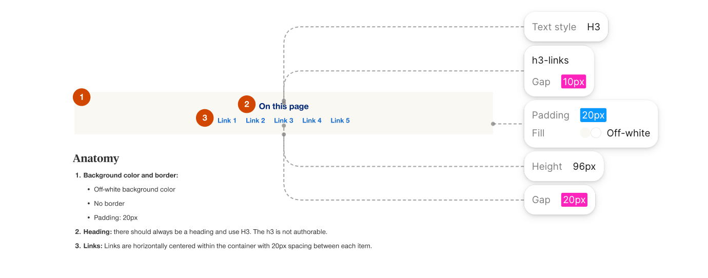 I focused on using existing colors and text styles in hopes to reduce dev complexity and keep consistency with our existing components in the design system. We use our light blue and gray colors for call-out containers on the pages, so I opted for our off-white for the background color of the anchor link menu component. I used our h3 and link styling for the text styles in the component.