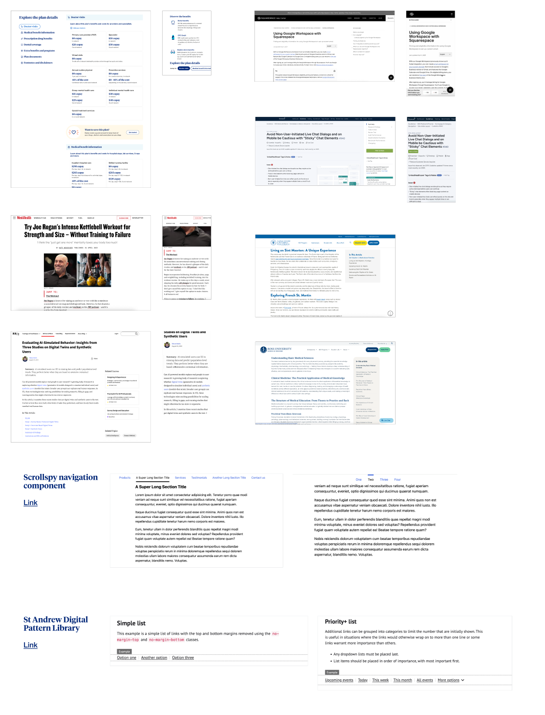 I continued my research, this time focused on finding different examples and treatments of anchor link menus. I found inspiration both within the enterprise and across the internet. I studied and compared the placement on the page, the interactions and tap targets, and how they differed from desktop to mobile.